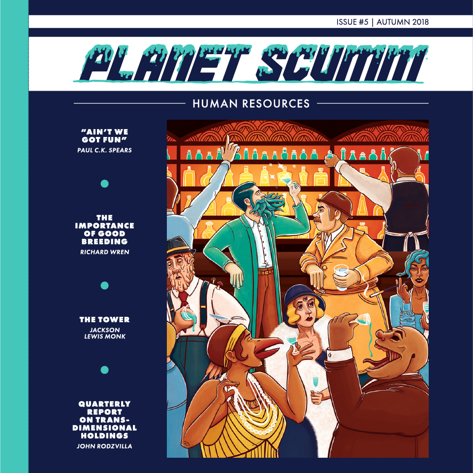 “Ain’t We Got Fun” by Paul C.K. Spears • The Importance of Good Breeding by Richard Wren • The Tower by Jackson Lewis Monk • Quarterly Report on Trans-Dimensional Holdings by John Rodzvilla • Original art from Alyssa Alarcón Santo and Sam Rheaume